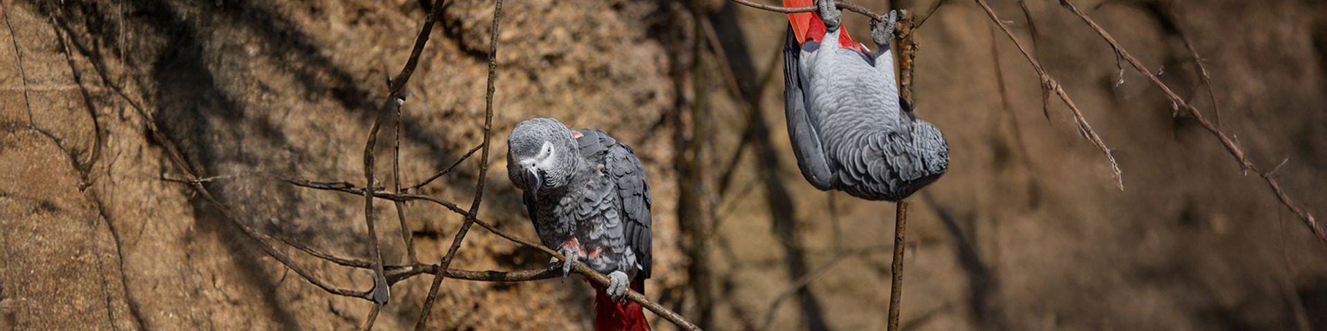 African Grey Parrots must never be kept alone. Pair housing with same-species, opposite-sex birds is mandatory – this is the only way they can develop psychologically and socially healthy.