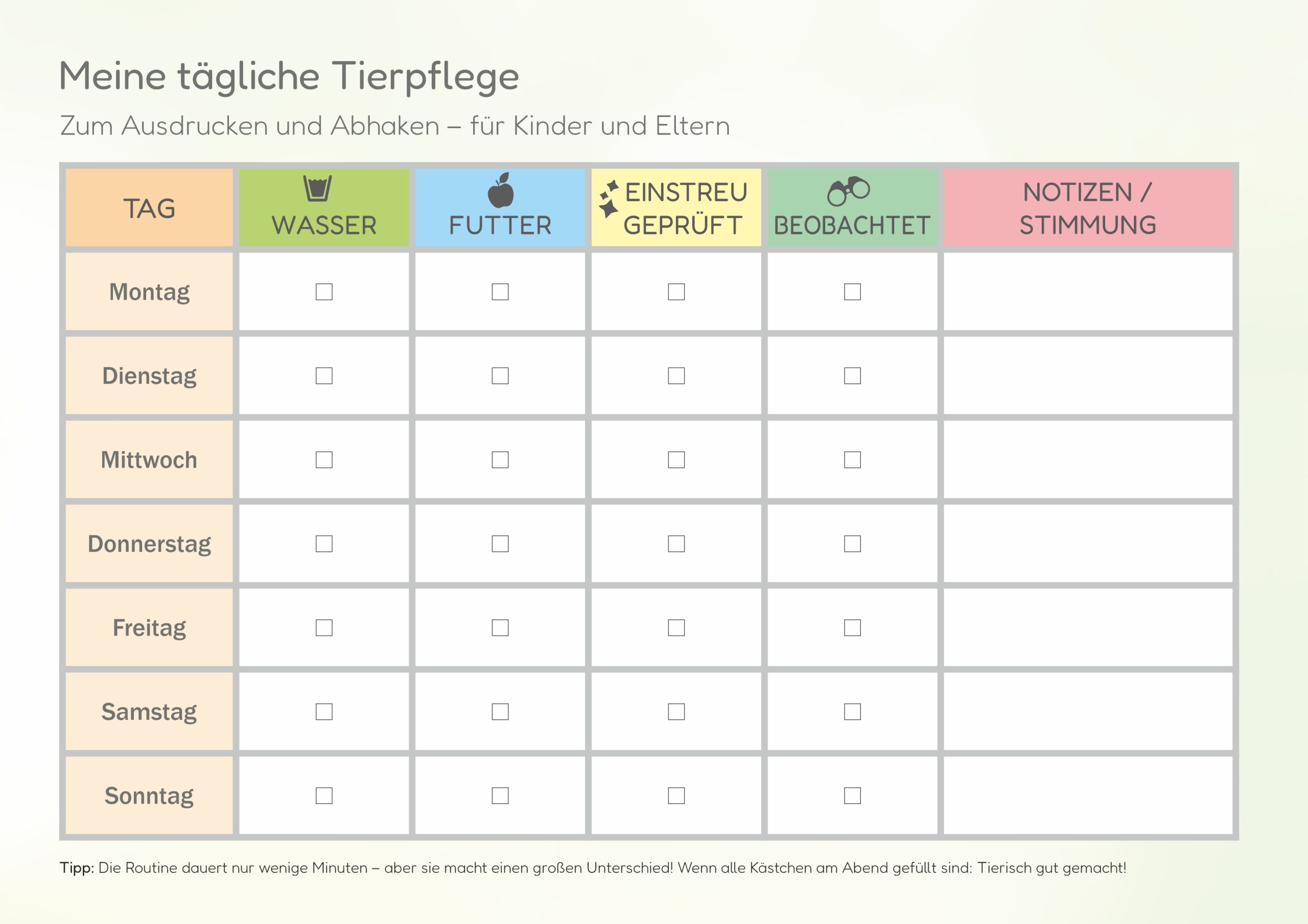 The schedule clarifies that animal care is teamwork. The main responsibility lies with the parents, while the children get involved step by step. A clear procedure avoids discussions and the typical “I thought you were doing that!”. At the same time, the children learn that their contribution counts and that it is easier to bear responsibility when you share it.