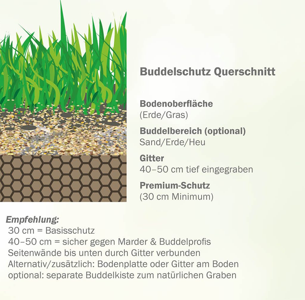 An outdoor enclosure should be secured all around with aviary wire, including at the top, so that no birds of prey can get in. A buried grid prevents rabbits from digging tunnels into adventure. Also plan shady areas, wind-protected corners and dry lying areas. The more varied the surface, the more exciting everyday life. Natural soil, roots and tunnels provide action – the main thing is that it is safe! .10.