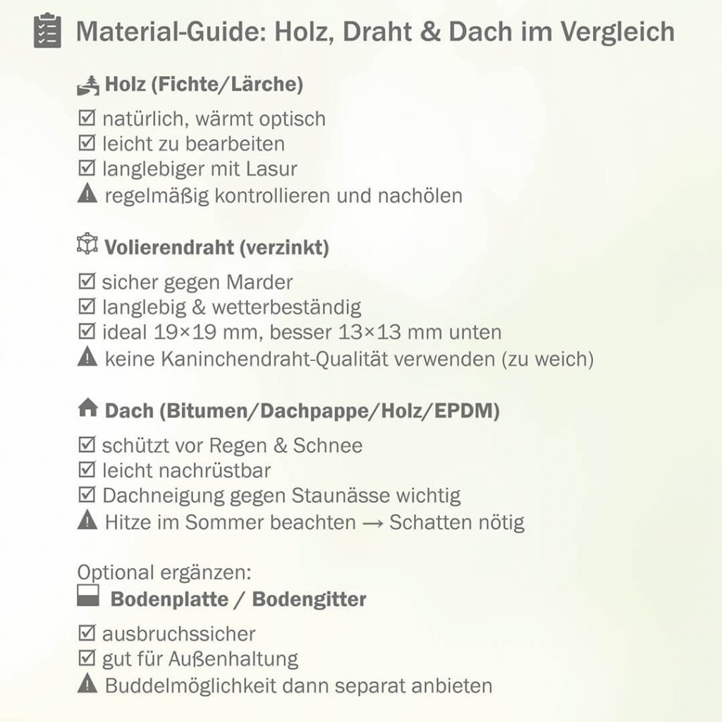 Wood is a classic: it is warm, natural and easy to work with. Spruce and larch are robust and protect against the weather, untreated or with animal-friendly glaze. Galvanized aviary wire with a maximum mesh size of 19 × 19 mm is recommended for the border (13 × 13 mm is better in the floor area to keep out martens and young animals). A wire thickness of approx. 1–1.2 mm is stable and bite-resistant. Roofing felt or bitumen protect against rain, while a sloping roof safely drains the water.