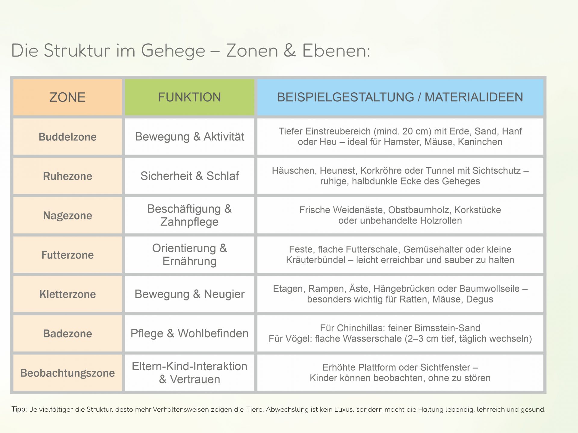 - Special zones: Digging boxes with soil or sand, chewing material made of willow or cork, bathing zones (dry or wet), movement and climbing zones, retreat and resting zones, feeding and storage zones, observation and activity zones.