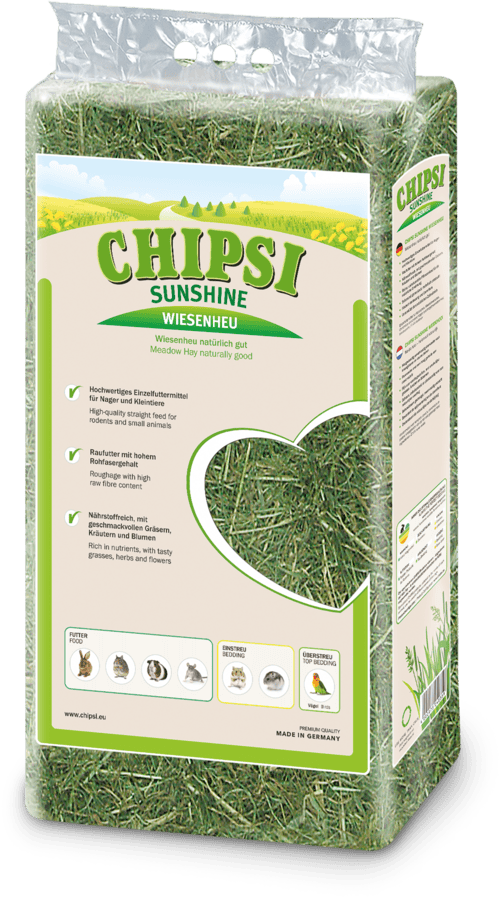 CHIPSI SUNSHINE is the classic favorite hay for many small animals. It comes from natural, species-rich meadows, is gently dried, and contains important vitamins and minerals for a balanced diet. With its high crude fiber content, it supports digestion